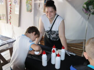 Dopoledne si pro nás Petronela připravila plán, abychom měli ještě krásnější sny, než doposud. Říká, že nebe je vlastně dost nudné, protože je tam málo barev. Proto si vyrobíme pestrobarevné polštářky pro sladké sny. A když už budeme celí zapatlaní, přidáme si k nim i naše bílá trička.