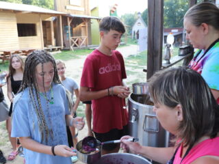 Podobně zapatlaní, ale z jiného důvodu, byli kuchtík Pejsek, kuchtička Kočička a dalších 6 vedoucích. Připravovali celé odpoledne večeři a váleli “miminka” – oblíbené táborové jídlo, kterého musí být vždy celá várnice. Všechna miminka zmizela dřív, než bys řekl: „Za sedmero vršky“.