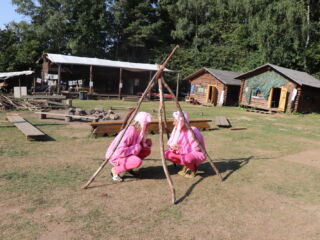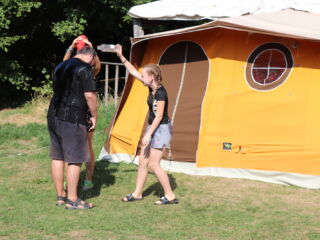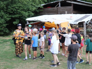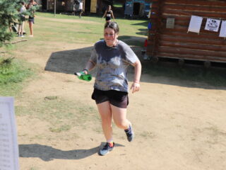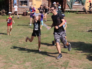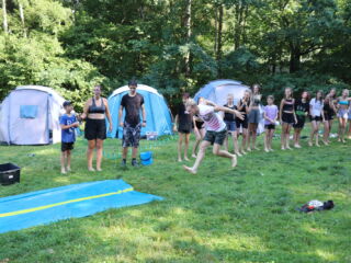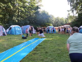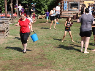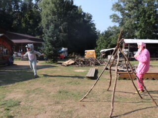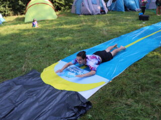 Na odpolední nástup se všichni ploužíme bez velkého nadšení. To se ale během chvilky změnilo – mezi děti se vřítili vedoucí s lahvemi a kyblíky plnými vody. Nikoho nemusíme dvakrát pobízet k odplatě – jak mávnutím kouzelného proutku najednou všichni ožili a strhla se velká “vodní bitva” – všichni proti všem!!! Když na nikom nezbyla ani nitka suchá, završujeme osvěžení ještě vodní skluzavkou!!! Nakonec se do toho musela vložit Petronela a trošku nás zase uklidnit. Oblékáme suché oblečení a znovu kvačíme na nástup.